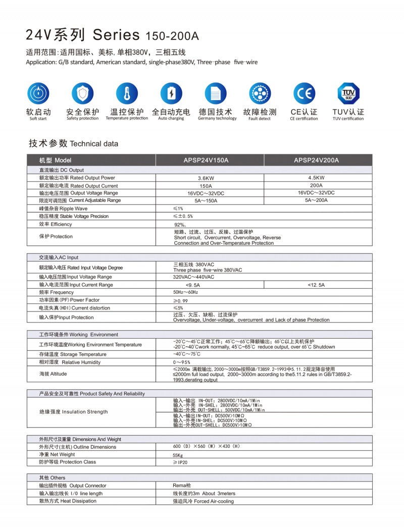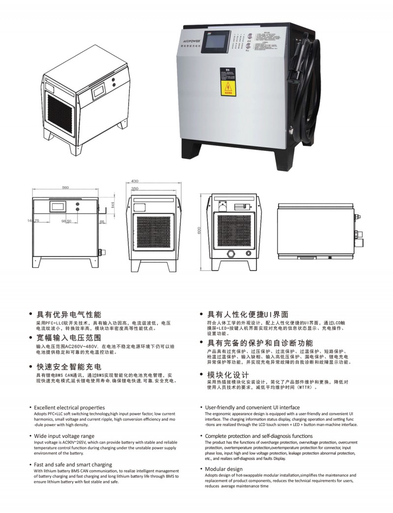 觸摸屏智能操作設(shè)計(jì):告別傳統(tǒng)按鍵方式,給您帶來更現(xiàn)代更具科技智能的操作體驗(yàn) 自動(dòng)充電:插槍自動(dòng)充電,簡(jiǎn)化充電流程,便于操作 兼容性高:80V200A兼容48V200A充電 多重保護(hù): 輸出短路,過流過壓保護(hù),反接保護(hù),電流導(dǎo)管保護(hù)等多重保護(hù) 預(yù)約充電功能:避開高峰用電時(shí)段,有效節(jié)省成本 雙語切換:中英文雙語隨需切換,跨越語言障礙,與世界接軌 人性化設(shè)計(jì):充電機(jī)背板內(nèi)部附部件明細(xì)及產(chǎn)品接線圖,方便客戶可更清楚的了解產(chǎn)品,便于維修,提高售后時(shí)效 獨(dú)特設(shè)計(jì): 內(nèi)置電磁鎖驅(qū)動(dòng)模塊,防止臨時(shí)斷電鎖槍 使用壽命更長(zhǎng):功率模塊預(yù)留20%空間,提高模塊的使用壽命 出色內(nèi)部結(jié)構(gòu): 內(nèi)部結(jié)構(gòu)左右出風(fēng),內(nèi)部電路不容易積粉塵,提高充電機(jī)壽命