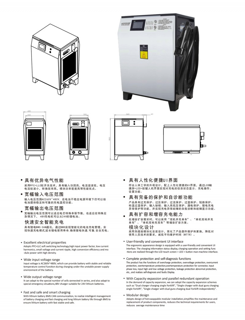 觸摸屏智能操作設計:告別傳統按鍵方式,給您帶來更現代更具科技智能的操作體驗 自動充電:插槍自動充電,簡化充電流程,便于操作 兼容性高:80V200A兼容48V200A充電 多重保護: 輸出短路,過流過壓保護,反接保護,電流導管保護等多重保護 預約充電功能:避開高峰用電時段,有效節省成本 雙語切換:中英文雙語隨需切換,跨越語言障礙,與世界接軌 人性化設計:充電機背板內部附部件明細及產品接線圖,方便客戶可更清楚的了解產品,便于維修,提高售后時效 獨特設計: 內置電磁鎖驅動模塊,防止臨時斷電鎖槍 使用壽命更長:功率模塊預留20%空間,提高模塊的使用壽命 出色內部結構: 內部結構左右出風,內部電路不容易積粉塵,提高充電機壽命