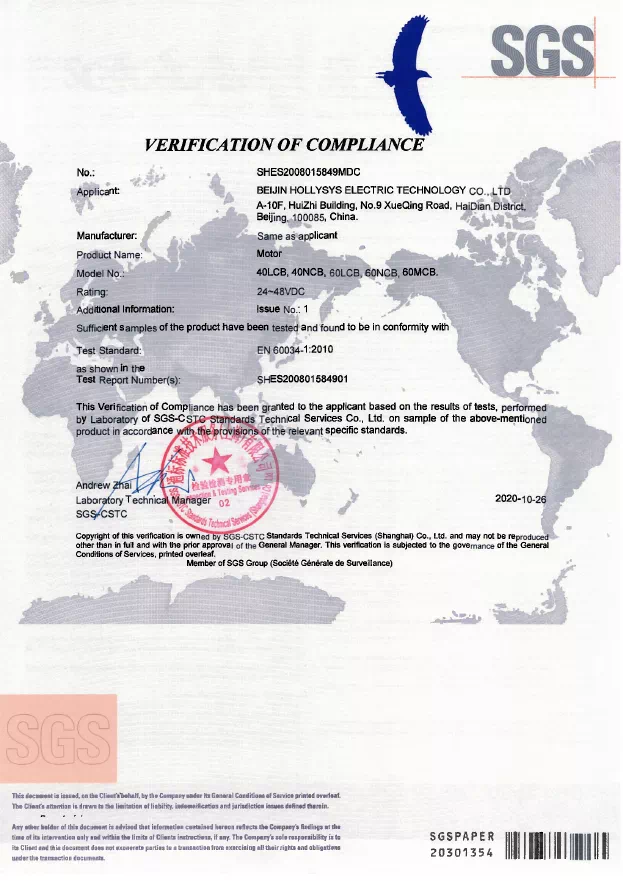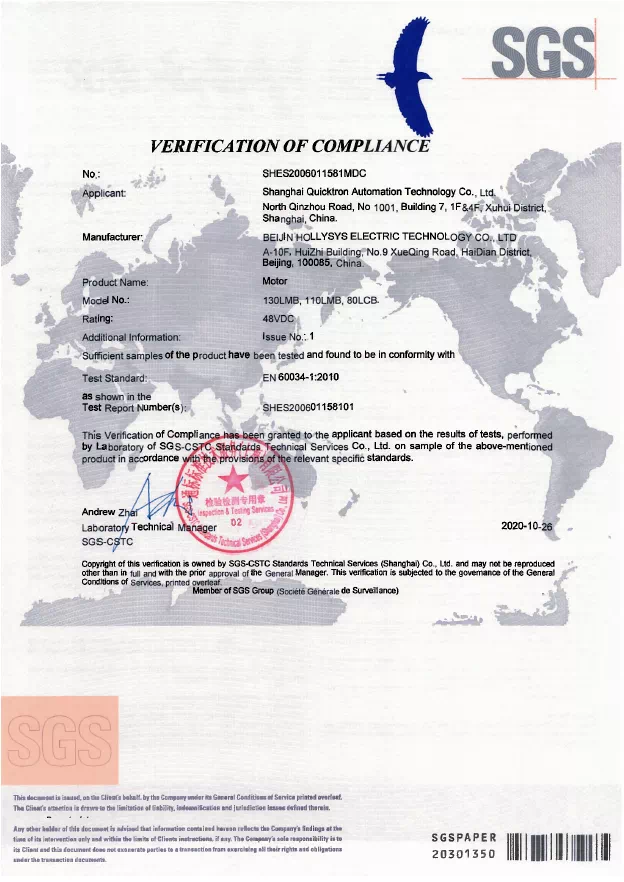 SGS是全球領先的檢驗、鑒定、測試和認證機構,是全球公認的質量和誠信基準。SGS作為國際權威認證機構為和利時電機產品頒發CE證書和RoHS證書,是對和利時電機技術實力的專業背書,增強了和利時電機產品在國際市場的品牌力,也助力設備制造商加速全球化步伐。