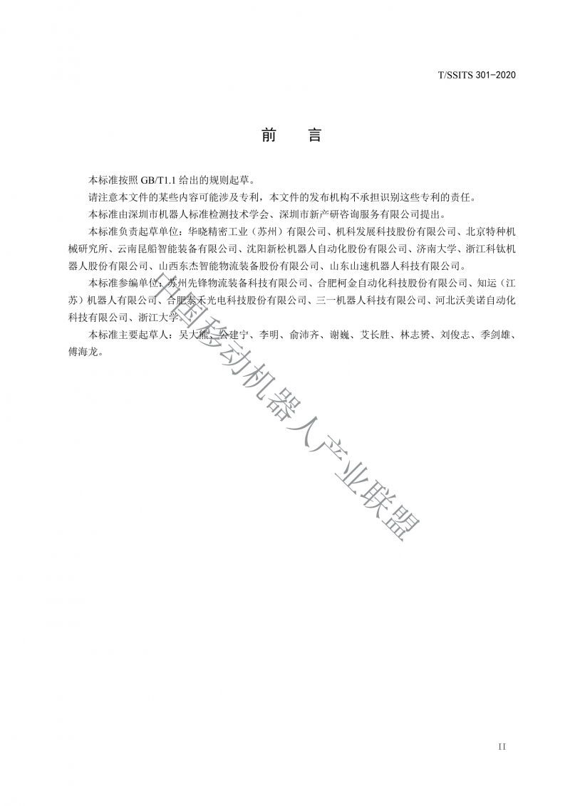 本標(biāo)準(zhǔn)參編單位∶,蘇州先鋒物流裝備科技有限公司、合肥柯金自動(dòng)化科技股份有限公司、知運(yùn)(江蘇)機(jī)器人有限公司、合肥余禾光電科技股份有限公司、三一機(jī)器人科技有限公司、河北沃美諾自動(dòng)化科技有限公司、浙江大學(xué)。?