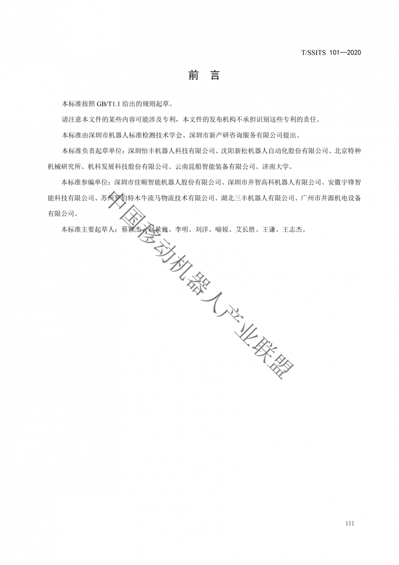 本標(biāo)準(zhǔn)參編單位∶深圳市佳順智能機(jī)器人股份有限公司、深圳市井智高科機(jī)器人有限公司、安徽宇鋒智?能科技有限公司、蘇州羅拍特木牛流馬物流技術(shù)有限公司、湖北三豐機(jī)器人有限公司、廣州市井源機(jī)電設(shè)備有限公司。?