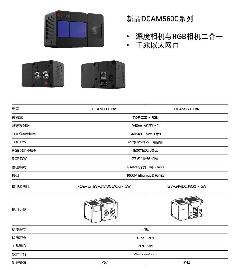 DCAM560C產(chǎn)品系列集成了團(tuán)隊(duì)近年來(lái)的研究成果,將2D RGB圖像與3D ToF面陣相機(jī)技術(shù)相結(jié)合,輸出在時(shí)間和空間上重合的RGB和3D圖像,每個(gè)像素都參與測(cè)距,不僅可以在獲取XY軸方向圖像的基礎(chǔ)上還能獲取Z軸方向上的距離信息,從而獲得高精度的深度圖,實(shí)現(xiàn)“三次元空間的感知能力”,用以滿(mǎn)足工業(yè)級(jí)客戶(hù)不同的使用場(chǎng)景,適用于工業(yè)自動(dòng)化,智能物流,智慧駕駛,智能安防,3D建模等需要3D感知物體與環(huán)境、構(gòu)建3D模型并進(jìn)行分析的領(lǐng)域。