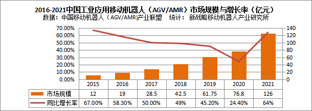 圖表:2015-2021中國(guó)工業(yè)應(yīng)用移動(dòng)機(jī)器人(AGV/AMR)市場(chǎng)規(guī)模(億元)與增長(zhǎng)率