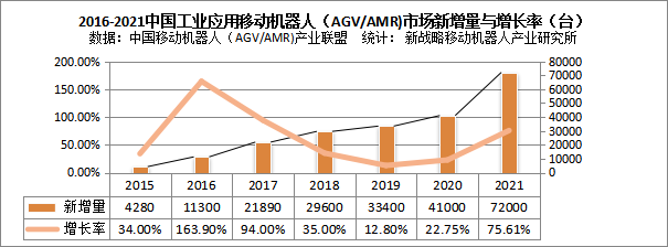 工業(yè)應(yīng)用移動(dòng)機(jī)器人(AGV/AMR)不僅能提高制造工廠的生產(chǎn)效率,更能大大降低用工風(fēng)險(xiǎn)。這也是我國(guó)強(qiáng)力深入推行《中國(guó)制造2025》和“十四五規(guī)劃”戰(zhàn)略部署的重要原因,根據(jù)中國(guó)移動(dòng)機(jī)器人(AGV/AMR)產(chǎn)業(yè)聯(lián)盟數(shù)據(jù)、新戰(zhàn)略移動(dòng)機(jī)器人產(chǎn)業(yè)研究所統(tǒng)計(jì),從2016年至2021年,中國(guó)市場(chǎng)工業(yè)應(yīng)用移動(dòng)機(jī)器人(AGV/AMR)產(chǎn)業(yè)年復(fù)合增長(zhǎng)率約46%,尤其是2021年度全球新冠疫情的大規(guī)模影響之下,同比增長(zhǎng)高達(dá)64%,遠(yuǎn)遠(yuǎn)超過(guò)絕大部分行業(yè)增長(zhǎng)速度。