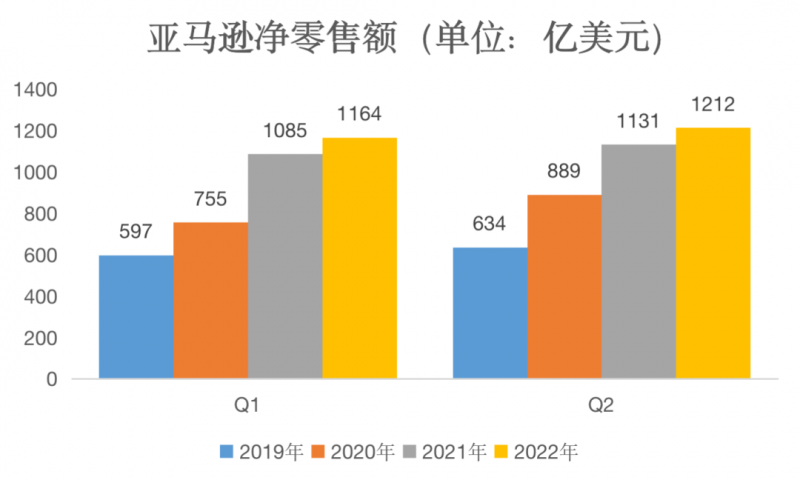財(cái)報(bào)數(shù)據(jù)顯示,今年Q1亞馬遜凈零售額為1164億美元,同比增長(zhǎng)7%;今年Q2凈零售額為1212億美元,同比增長(zhǎng)還是7%。
