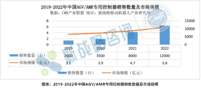 根據(jù)CMR產(chǎn)業(yè)聯(lián)盟數(shù)據(jù),新戰(zhàn)略移動機器人產(chǎn)業(yè)研究所統(tǒng)計,2022年AGV/AMR專用控制銷售數(shù)量約為12000臺,同比增長50%,市場規(guī)模在5.8億左右,同比增長23.4%。