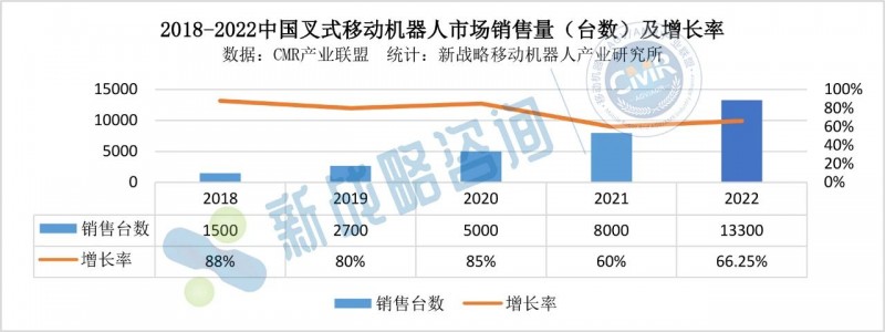 CMR產業聯盟數據、新戰略移動機器人產業研究所統計,2022年中國叉式移動機器人銷量達13300臺,同比增長66.25%,市場規模約為34.68億元,同比增長41.55%,市場增速明顯。