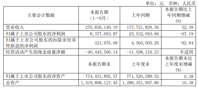 德馬科技8月20日晚間發布半年度業績報告稱,2023年上半年營業收入約6.23億元,同比減少2.86%;歸屬于上市公司股東的凈利潤約4798萬元,同比增加2.73%;基本每股收益0.4元,同比增加2.56%。