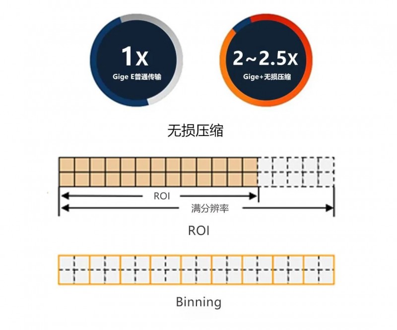 新型號支持無損壓縮功能,突破千兆網帶寬限制,將行頻提升2倍左右;同時可支持ROI/Binning提行頻,靈活兼容低分辨率的高速應用需求,提升用戶產能。