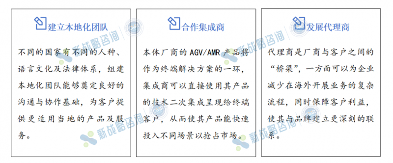 從市場布局來看,當前中國AGV/AMR企業海外主要目標市場主要包括歐洲、北美、日韓和東南亞等地區。這些地區對移動機器人的需求量較大,且市場增長迅速。而國內各家AGV/AMR企業布局海外,其進入模式主要有以下三種: