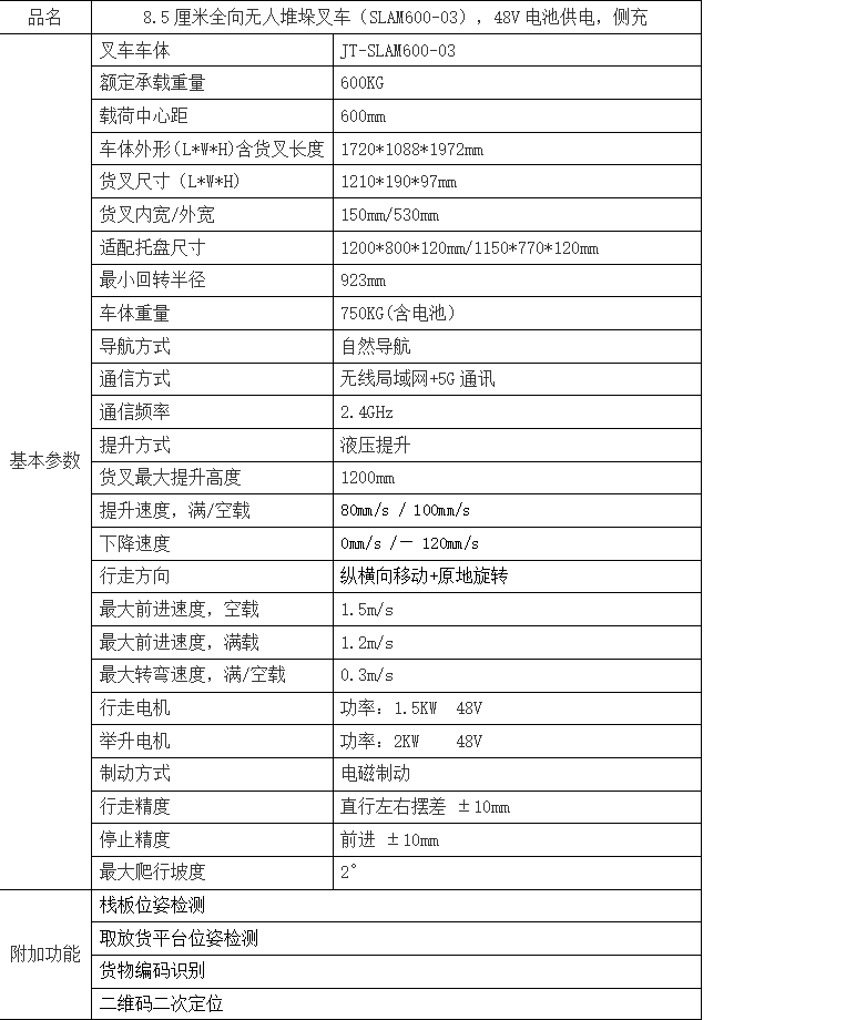 8.5厘米全向無(wú)人堆垛叉車(chē),采用自然導(dǎo)航及二維碼二次定位技術(shù),可縱橫向移動(dòng)及原地旋轉(zhuǎn),全向運(yùn)行;載重600KG;最大舉升高度1200mm;配備嘉騰自主研發(fā)的超低、超窄全向模組,體積小巧、運(yùn)行靈活,支持2M巷道物料搬運(yùn);支持棧板位姿、貨物編碼、貨位狀態(tài)檢測(cè);使用3D 激光雷達(dá)和安全型傳感器全方位避障;配備行車(chē)記錄儀和運(yùn)行輪廓警示燈。