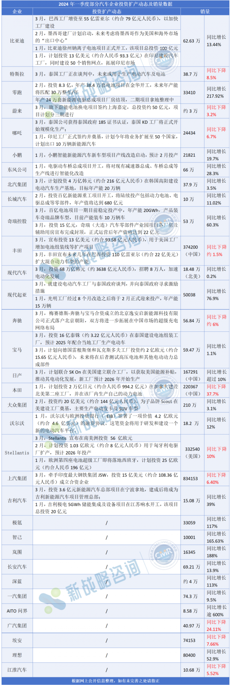 圖表:一季度部分汽車企業(yè)投資擴產(chǎn)動態(tài)及銷量數(shù)據(jù)
