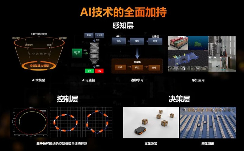 賈永華也提到感知智能的重要性:“正如人的眼睛一樣,未來,我們要給工業(yè)制造裝上更多的‘眼睛’,賦予機(jī)器感受外部世界的能力,這是機(jī)器人理解和執(zhí)行任務(wù)前提。”海康機(jī)器人圍繞機(jī)器視覺應(yīng)用特點(diǎn),近年來重點(diǎn)研究了AI小樣本學(xué)習(xí),無監(jiān)督學(xué)習(xí)以及行業(yè)大模型等技術(shù)難題,推出了10多項(xiàng)AI算法工具,積極推進(jìn)AI+機(jī)器視覺在更多行業(yè)的滲透應(yīng)用;同時(shí)海康機(jī)器人將AI算法和經(jīng)典算法相結(jié)合,推出了AI模板匹配、AI讀碼、邊緣學(xué)習(xí)等特殊算法,部分讀碼相機(jī)已能實(shí)線上千幀的讀碼和分析。并在環(huán)境標(biāo)注方面,基于大模型的特征,海康機(jī)器人構(gòu)建了全景的三維的標(biāo)注地圖,通過這樣的方式,海康機(jī)器人有效提升了建圖定位、點(diǎn)云識(shí)別、視覺標(biāo)識(shí)檢測(cè)等多種環(huán)境感知的識(shí)別精度,使機(jī)器對(duì)世界的認(rèn)識(shí)更全面。“在控制層面,我們基于模型的最優(yōu)控制,運(yùn)行規(guī)劃消除偏差,通過迭代學(xué)習(xí),使機(jī)器人逐漸適應(yīng)各種環(huán)境,未來其適應(yīng)能力會(huì)越來越強(qiáng),可以提升控制的自主性和魯棒性。而在當(dāng)前的決策層面,我們基于AI路徑規(guī)劃能力,通過大量規(guī)劃路徑數(shù)據(jù)的學(xué)習(xí),使網(wǎng)絡(luò)具備專家級(jí)的路徑規(guī)劃能力。同時(shí)利用網(wǎng)絡(luò)推理并進(jìn)行預(yù)算,實(shí)現(xiàn)半徑毫秒級(jí)的快速路程規(guī)劃。”賈永華表示,在AI的加持下,極大地增強(qiáng)了智能系統(tǒng)生產(chǎn)能力,這種能力不斷滲透到各個(gè)場(chǎng)景、業(yè)務(wù)和行業(yè),可以有效地將AI技術(shù)真正轉(zhuǎn)變?yōu)樯a(chǎn)力。