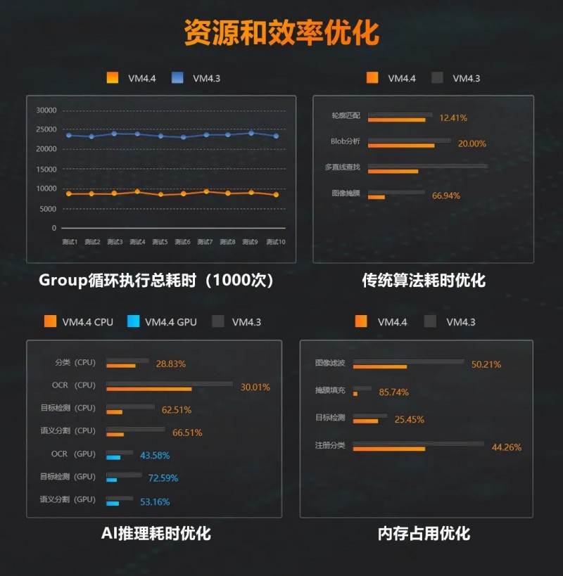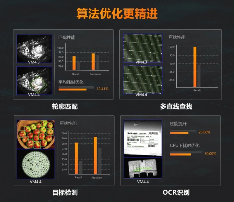 VM4.4對模板匹配、Blob、目標(biāo)檢測、OCR、圖像處理、讀碼等多個算法工具進行了效率提升和性能優(yōu)化,基于海量工業(yè)場景數(shù)據(jù),推出了通用識別模型,無需二次訓(xùn)練,能直接滿足大多數(shù)工業(yè)場景的檢測需求。