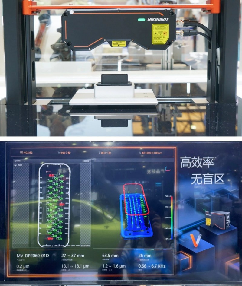 采用海康機器人自研的程控條紋光傳感器進行采圖,對車漆表面的顆粒,漆疤、劃痕、氣泡、針眼等缺陷進行在線全檢,最小可實現0.2mm的缺陷檢測,借助機械臂的柔性,檢測可達性區域幾乎覆蓋100%車身。