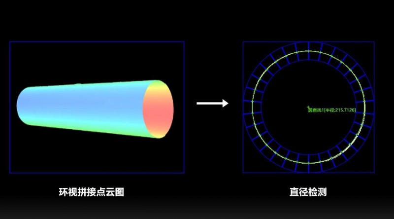 通過(guò)多相機(jī)環(huán)視拼接,還原線纜/管材外表面點(diǎn)云,實(shí)時(shí)檢測(cè)線纜/管材任意橫截面的直徑,避免不良品流出。