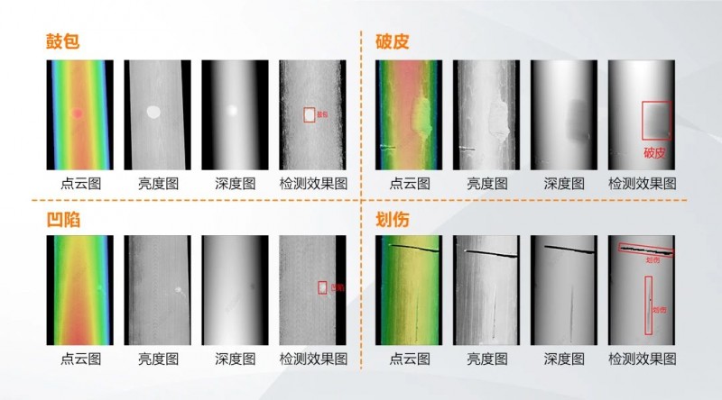 通過(guò)多相機(jī)環(huán)視拼接,可實(shí)現(xiàn)線纜/管材外表面點(diǎn)云數(shù)據(jù)的采集,通過(guò)VM 3D軟件,可對(duì)線纜/管材表面鼓包、破皮、凹陷、劃傷等缺陷進(jìn)行有效檢出。