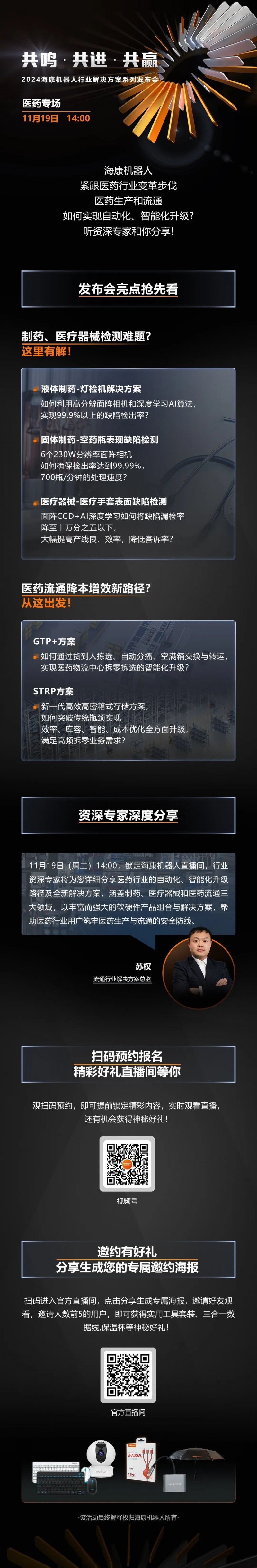 11月19日(周二)14:00,海康機器人資深專家將帶來醫藥行業創新解決方案分享并進行實時答疑,分享官方直播間邀約海報、觀看直播、填寫問卷更有機會贏取多種精美好禮,即刻點擊下方按鈕預約吧!