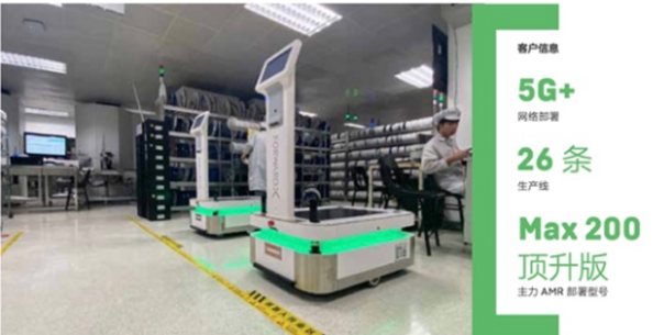 全球領(lǐng)先的某大型通信設(shè)備公司無線小基站智能工廠項(xiàng)目,迦智科技近百臺自然導(dǎo)航AMR,在5G技術(shù)低延時、高帶寬、高速率的傳輸特性加持下,實(shí)現(xiàn)了與用戶現(xiàn)場的MES、WMS以及第三方設(shè)備間的互聯(lián)互通,信息上傳下達(dá),交互協(xié)同作業(yè)。