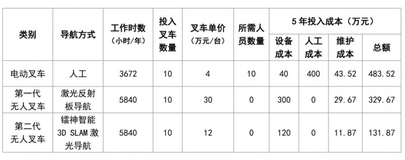 上表假定了某倉(cāng)庫(kù)分別投入10輛電動(dòng)叉車(chē)、激光反射板導(dǎo)航叉車(chē)、3D SLAM激光導(dǎo)航叉車(chē),并以5年折舊進(jìn)行投資回報(bào)對(duì)比分析。顯然,人工操作的電動(dòng)叉車(chē)投入成本最高,經(jīng)濟(jì)回報(bào)效益最低;激光反射板導(dǎo)航叉車(chē)雖然單臺(tái)叉車(chē)成本高,但在五年折舊期后總投入還是比人工的電動(dòng)叉車(chē)要節(jié)省了153.85萬(wàn)元,近32%的成本;而采用鐳神智能3D SLAM激光導(dǎo)航方案的無(wú)人叉車(chē),五年總投入成本僅131.87萬(wàn),比人工電動(dòng)叉車(chē)節(jié)省了73%的投入成本、59%的時(shí)間成本,而且五年期間倉(cāng)庫(kù)可以靈活進(jìn)行擴(kuò)建或調(diào)整,全面滿(mǎn)足工業(yè)互聯(lián)網(wǎng)時(shí)代下客戶(hù)終端市場(chǎng)隨時(shí)變化的需求,具有更突出的綜合效益!