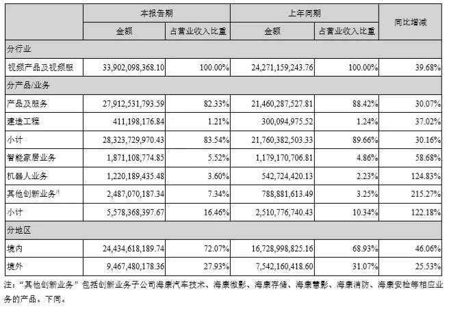 報告中主要營業收入組成如下,創新業務和機器人業務增長迅速,表現非凡。其中,海康機器人實現營收12.2億,同比增長124.83%。