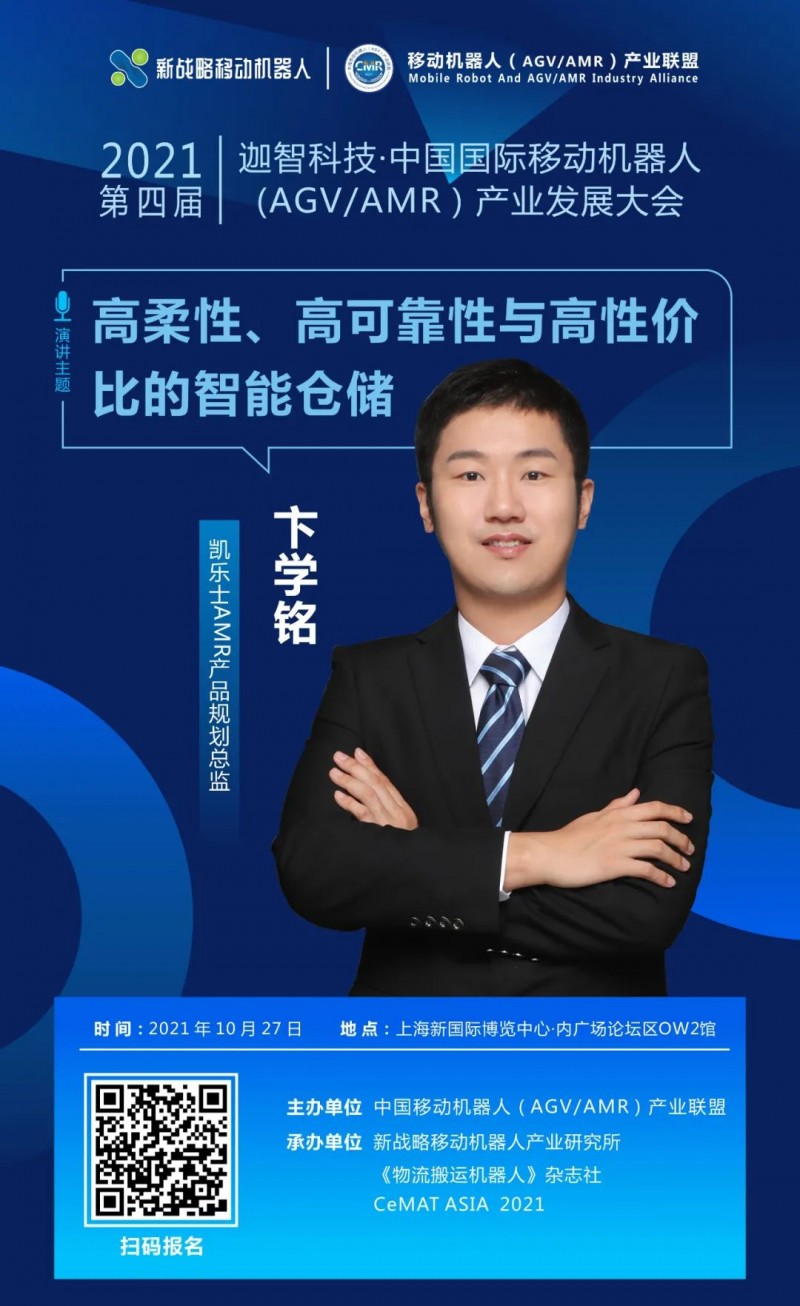 10月27日,在中國移動機器人(AGV/AMR)產業聯盟主辦的《第四屆國際移動機器人大會》上,凱樂士AMR產品規劃總監卞學銘將帶來“高柔性、高可靠性與高性價比的智能倉儲”,敬請期待!