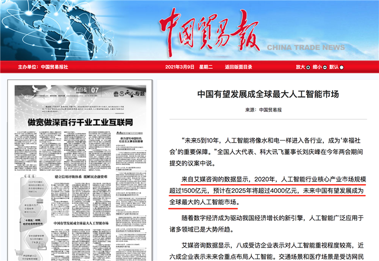 以人工智能為例,中國作為制造業(yè)大國,為其提供了豐富的應用場景。據(jù)艾媒咨詢數(shù)據(jù):2020年人工智能行業(yè)核心產(chǎn)業(yè)市場規(guī)模將超過1500億元,預計在2025年將超過4000億元,中國人工智能產(chǎn)業(yè)在各方的共同推動下進入爆發(fā)式增長階段,市場發(fā)展?jié)摿薮螅磥碇袊型l(fā)展為全球最大的人工智能市場。