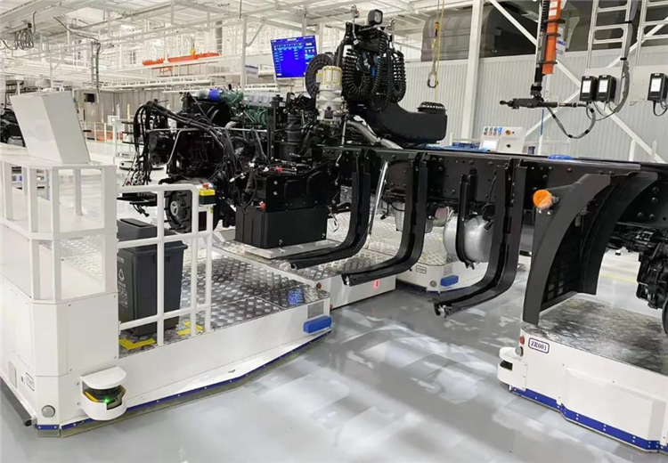 大體積、大重量的產品如何實現生產裝配環節的柔性輸送,一直都是汽車制造工廠裝配工藝的難點。新松開創性地將移動機器人雙車聯動轉彎技術在重載、超長物體運輸環節投入應用,終結了國內重卡移動機器人裝配線只能“一線到底”的尷尬局面,有效解決了市場痛點。