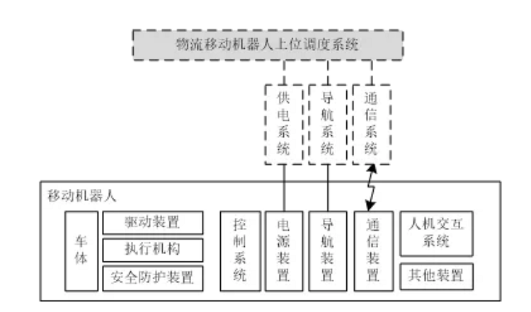 物流移動機器人系統由固定部分與移動部分組成。其中,固定部分即地面系統(Stationary system),包括上位調度系統、導航系統、充電系統及通信系統;移動部分即為移動機器人單機,包括車體、驅動裝置、導航裝置、通信裝置、車載控制系統、安全防護裝置、執行機構等,如圖1所示。