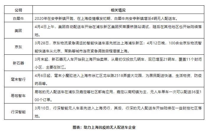 自疫情爆發(fā)后,白犀牛、新石器、易咖智車、毫末智行、行深智能等多家無人配送車企業(yè),第一時間馳援上海開展無人配送,協(xié)助商超抗疫保供,應(yīng)對訂單激增、運力緊張所帶來的挑戰(zhàn)。